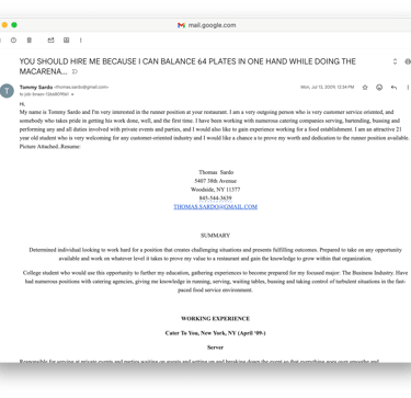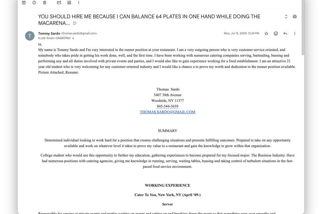 My career in Restaurant and Food Tech started because I had no idea what I wanted to do with my life at 21 years old, so I decided to move to New York City and figure out a way to make money. I had done some catering here and there and somebody told me that you could make decent money bussing tables and running food. So I got on Craigslist (remember that?!) and applied to everything I could find, showed up at every Open Call and eventually got my foot in the door. I knew I had to set myself a part, and I wanted to work with somebody that fit my personality, so this was the email that I finally got a response from Bareburger and (later) the Standard Hotel that started my journey: